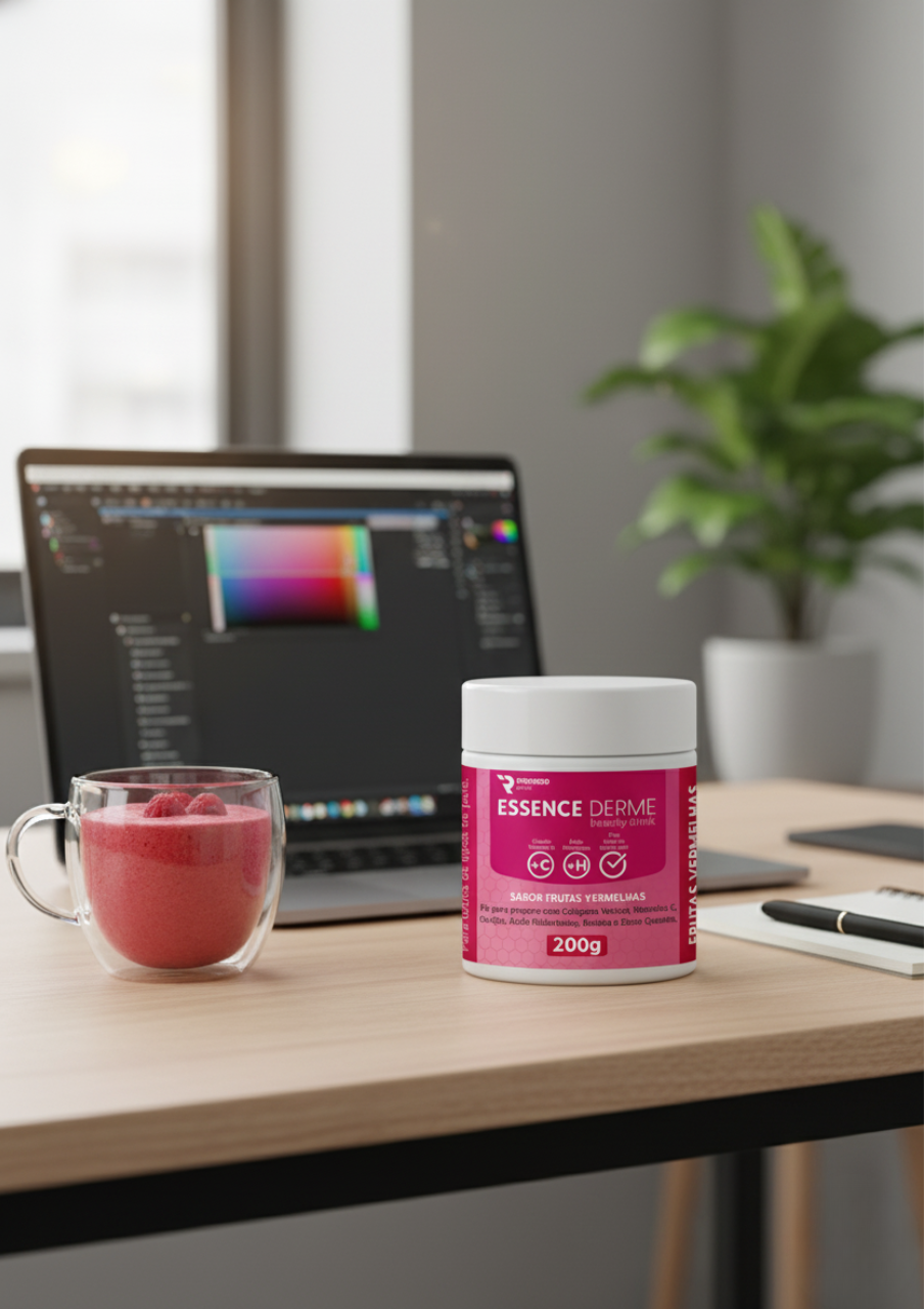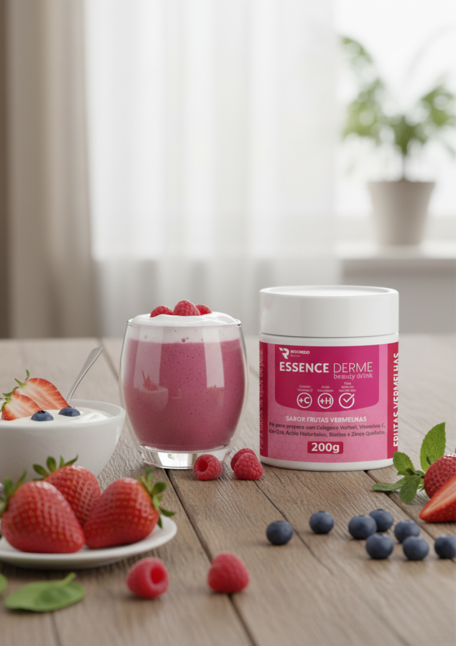 Com sabor delicioso de frutas vermelhas, o Essence Derme é ideal para quem quer cuidar da beleza de forma prática, saborosa e eficaz.